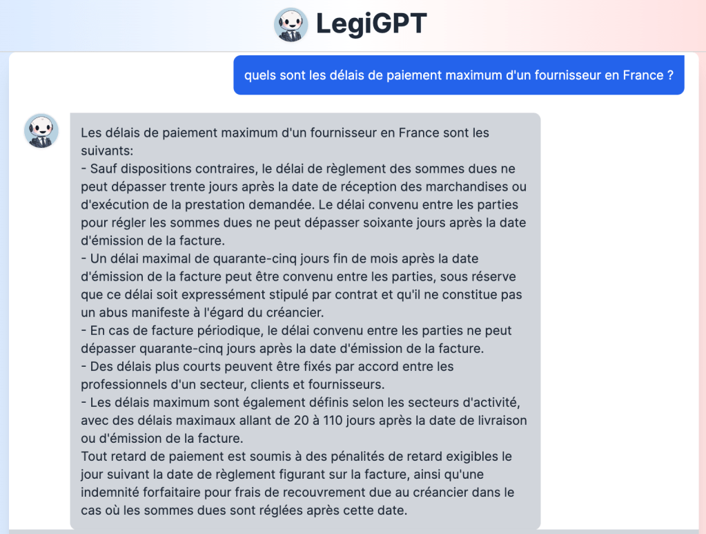 Nous avons donc tenté une approche un peu plus pratique et représentative de ce que pourrait être l’usage d’une telle solution dans un contexte professionnel, en interrogeant sur les délais de paiement d’un fournisseur en France.