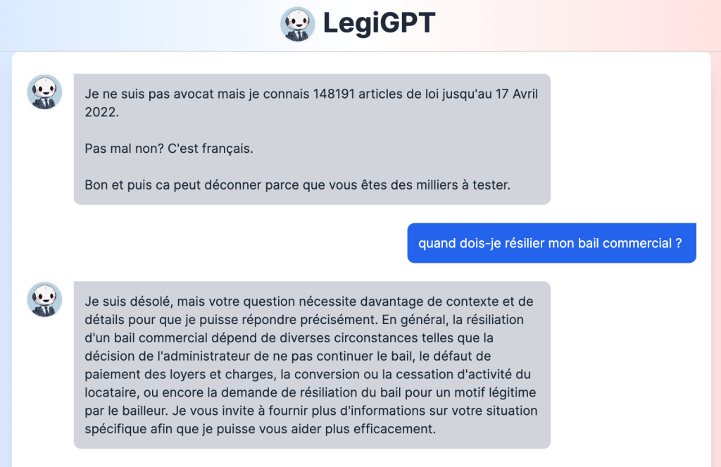Au jour où nous écrivons cet article, nous sommes à la fois extrêmement déçus mais malheureusement peu surpris du manque d’inventivité et de technicité de ces pseudo-produits qui veulent s’attaquer au juridique par un copier-coller de Chat-GPT.